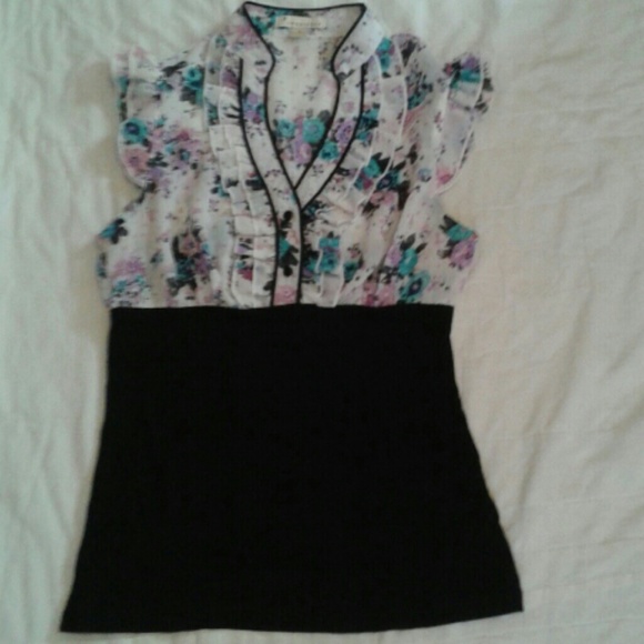 Only worn once! Top is sheer chiffon with gorgeous flowers and ruffles also top has a sexy deep plunge but also buttons down even more! I love the tummy to this it gives you tummy control and its black which naturally makes you appear thinner! No damage stai s, holes, ect.... size Small