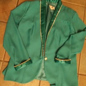 LOVELY FULL LENGTH SPECIAL OCCASION DRESS WITH JACKET. BOTH FULLY LINED. FABRIC POLYESTER, DRY CLEAN. STUNNING RHINESTONE TRIM. DRESS SHOULDER STRAPS, LONG BACK ZIPPER, BUST 42", WAIST 40", HIPS 47", BACK 18.5" SLIT PLEAT, LENGTH 59". JACKET SHOULDERS WTIH SHOULDER PADS 18", BUST 48", SLEEVES 25", JACKET LENGTH 26.5".