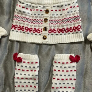 EUC sweater poncho, leg warmers and mitt set. Cute design perfect for winter. Size 0-12 months but I’m sure this could run up to 2 years.