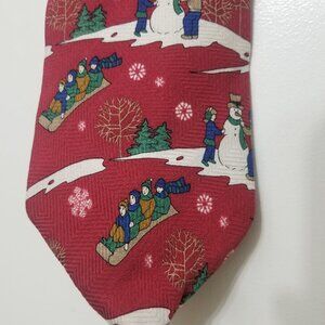 Luxurious red textured tie with snow and sledding, Milano brand. It's 56 inches long from tip to tip, and is 100 percent silk.