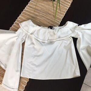White with black top stitch at ruffle neck and sleeve , fitted with a hidden side zipper . Really beautiful on.