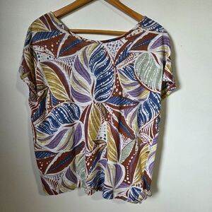 EUC FOLIAGE PRINT 100% LINEN CAP SLEEVES TOP SIZE MEDIUM WOMENS