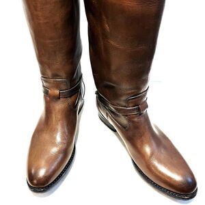Distressed leather and an asymmetrical topline give FRYE's Lindsay Plate boot a classic riding profile with hardworking sensibilities. Cross-band detailing at the heel with branded nameplate. Leather sole. Pull-on. Hardly worn, but does have a scratch on one shaft that is hard to see unless you really look for it. See pics