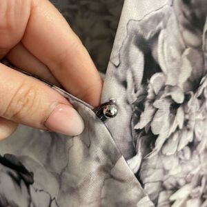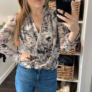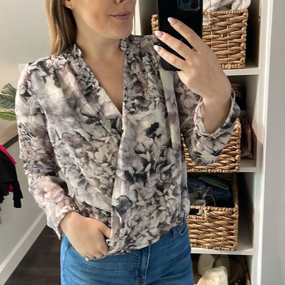 Excellent condition H&M gray floral blouse. Size 6 or small. Pretty gray floral design that looks slightly tie dye. Front wrap bottom style. No holes, stains, marks, etc.
