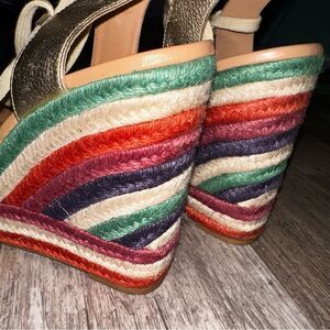 Upper: Constructed of gold metallic tumbled leather with a multi-colored fiber jute detailed wedge and platform.