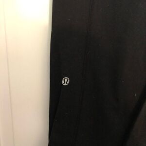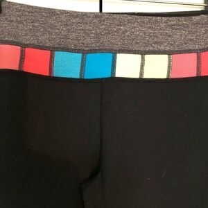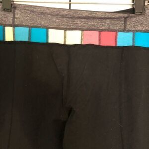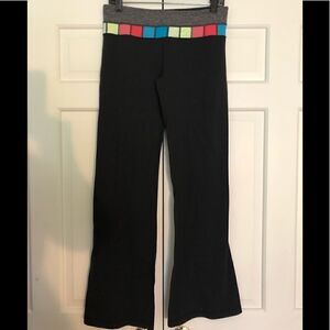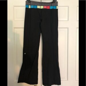 EUC Lululemon Groove Pants Reversible. Size 8. Minimal piling in gusset. Band is charcoal grey with blocks of bright colors. Reverse side is solid black. Waist laying flat: 15” unstretched. Rise is approx 9”, inseam 33.5”, leg opening 10.25”.