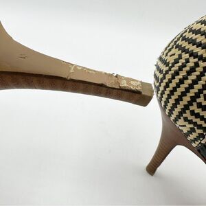 Slight wear to sole and some damage to the inside edge of the stacked stiletto heel as shown. Hard to notice when worn. Please see photos for additional details. Measurements are in the photos.