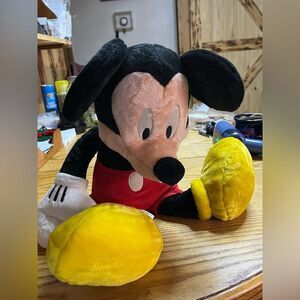 21” plush Mickey Mouse has yellow shoes, red shorts and whitete gloves. Velvet bulbous nose, stitching at the gloves and embroidered detail on the tongue