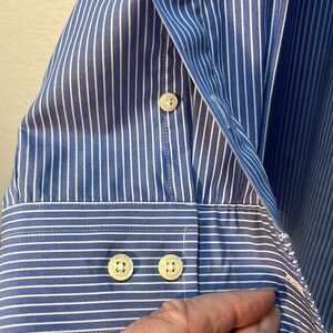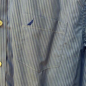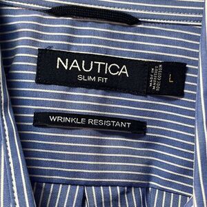 Elevate your wardrobe with the Nautica Men's Blue Striped Shirt. Perfect for both casual and formal occasions, this shirt offers a classic look with its crisp blue stripes. Experience comfort and style with Nautica's quality craftsmanship.