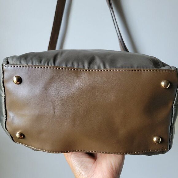 EUC OLIVE AND BROWN SLING BAG TWIST LOCK CLOSURE