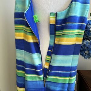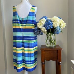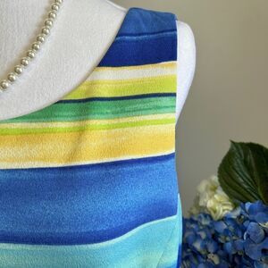 Embrace the casual elegance of this Pappagallo sundress, featuring a sleeveless design and a classic crew neck. The blue and white stripes create a fresh, nautical-inspired look, perfect for resort wear. Its midi length and comfortable fabric make it an ideal choice for warm weather outings.