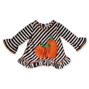 Rare Editions Brown Stripe Long Sleeve Baby Tunic Top with Pom Pom Trim and 2 Pumpkin Appliques. Adorable with Leggings or a cute matchjng bloomer, diaper cover.