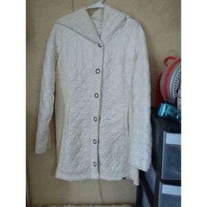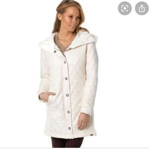 Prana Diva Long Hooded Jacket/Coat-Fantastic Condition!! Beautiful Cream Color-Sherpa Lined-Full Zip & Snap Closure-Front Zip Pockets-Ribbed Side Panels For Extra Stretch-Longer Length Covers Your Assets. Lightweight But Very Warm