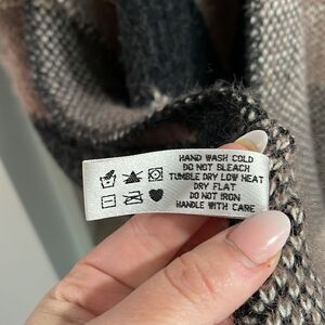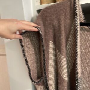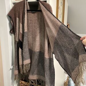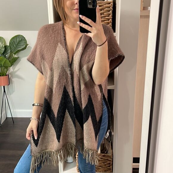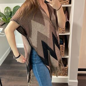 Excellent condition super soft open cape. Deep khaki and black chevron details. Fringe detail across bottom. Open loose sleeves. One Size, I'm typically a small to medium but I know it can fit a larger size. I like to wear with a long sleeve black shirt underneath and jeans with black boots. A belt around the waist looks nice too.