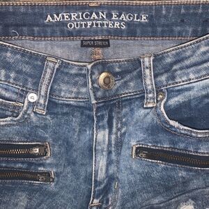 Cute hi-rise super stretch American Eagle Outfitters jean shorts. Distressed. Inseam measures about 2 inches and waist measures about 14-1/2 inches. Zippered accents. Size 8.