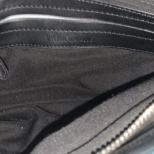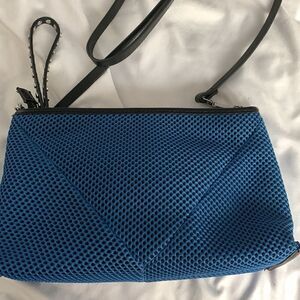 This is an edgy, yet sophisticated blue mesh over black crossbody which strap an be removed to make it a wristlet