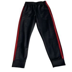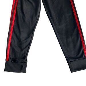 Excellent condition classic adidas track pants in black with red stripes down the sides. Elastic waist with inner drawstring and side pockets. Tapered leg with elastic at ankles.