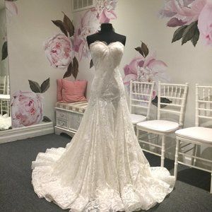 Description: Lightly beaded with sequins chantilly lace, full A-line silhouette. Strapless with a delicate sweet heart neckline. Beautiful V- back with zipper and decorative buttons.