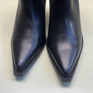 These black heeled boots feature a sleek leather-like material and a distinctive Cuban heel, offering a modern twist on a classic Western style. The boots are designed with a pointed toe and convenient pull tabs for easy wear, making them a versatile addition to any wardrobe.