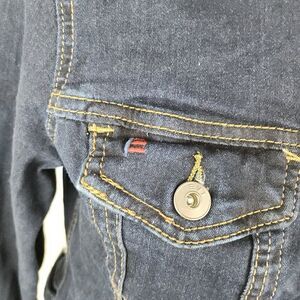 EV1 Dark Wash Stretch Denim Trucker Jean Jacket Love Graphic on Back Womens M