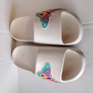 Off-White slide sandals with a colorful butterfly accent. Ideal for everyday comfort and play.