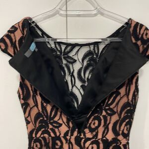 EVA FRANCO Anthropologie black pink lace sheer front midi cocktail dress S