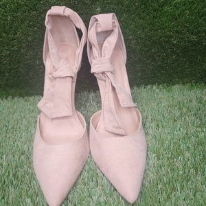 Size 8: Eva Mendes Tan Suede Pointy Wrap-Up Heels in Excellent condition.