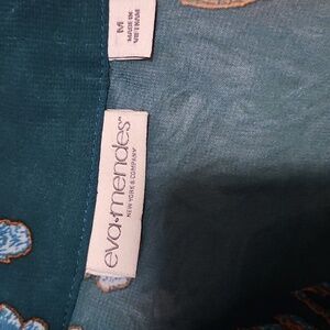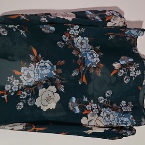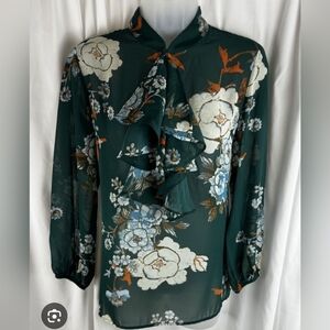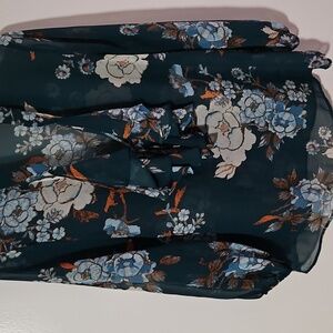 The image shows a woman blouse with a floral print. The blouse is dark green with white and blue flowers, and has a bow on the neckline. The blouse appears to be of a lightweight and transparent material, such as gauze.