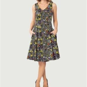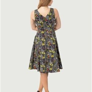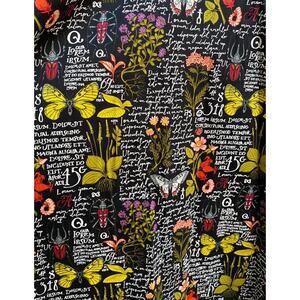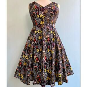 Black dress with a print of bugs, butterflies, flowers plants and text in Latin. You will see so many beautiful colors, bright yellow, purple, olive green, orange, pink, red and more! Made of a cotton spandex blend, has stretch and a wonderful full skirt for that perfect fit and flare! This dress is not lined and has pockets!