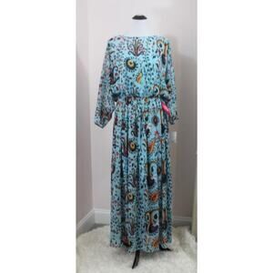 Women's dress by EVA by EVA FRANCO. Size 14. Blue, turquoise, paisley print. 3/4 sleeve, elastic waist, maxi length, boho style, great fall dress. NWT new with tags. 100% polyester. Has a solid slip to about the knee, then semi sheer lightweight dress.
