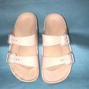 EVA flat pink comfortable double buckle slide sandals. Birkenstock lookalike in dusty rose color. Slightly worn on the bottom, see pictures.