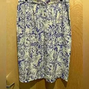 This skirt is in EXCELLENT VINTAGE CONDITION. There are no fabric flaws, stains, tears, pilling, etc on this skirt. It is 100% silk and the pattern is a gorgeous white and blue.