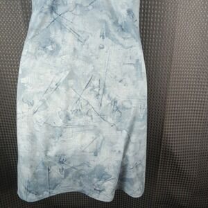 EVCR women's athletic dress in a blue and gray abstract/marbled print. Features a flattering scoop neckline, racerback straps, and built-in modesty shorts for comfort and coverage. Lightweight stretch fabric makes this great for casual wear, athleisure, travel, or light activity.