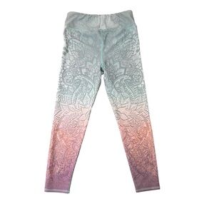 These dreamy EVCR leggings feature a stunning mandala design that fades from soft teal to rose gold and deep plum. Super stretchy and comfy with a flattering high rise waistband — perfect for yoga, pilates, or just looking cute while running errands. Medium size, gently worn with lots of life left