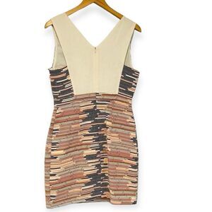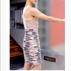The textured print has soft, sandy colours mixed with faint greys and pastel pinks. The structured fit has a flattering, body conscious shape and wide shoulder straps. The dress features a contrasting white panel across the shoulders and upper back. Modern and sleek!