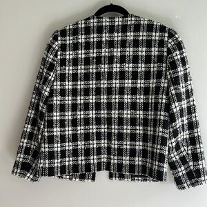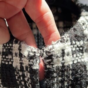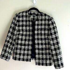 Evelyn & Arthur tweed jacket with hook and eye closure at neck. Features 2 pockets in each side, smaller on chest and larger pocket near waist. Good used condition, no known issues.