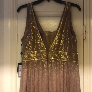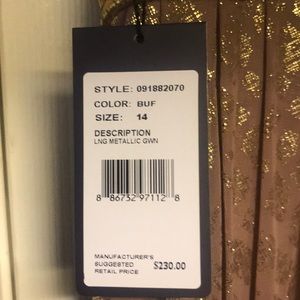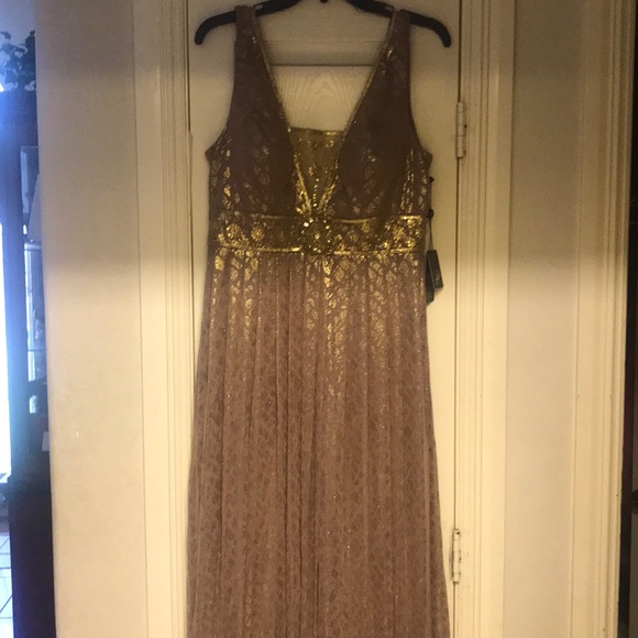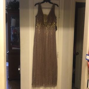 Beautiful evening dress perfect for wedding anniversary beautifully detailed. Color is like a light mocha with golden color.