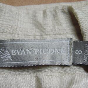 This is a gently used blazer by Even-Picone it is a ladies size 8 armpit to armpit measure 17 inches and it is 22 inches long the material tag is missing the exterior of the jacket feels like linen and the interior feels like satin it is in great shape no fading fraying rips or stains