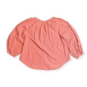 This lightweight and stylish blouse features a soft textured stripe pattern in a warm burnt orange hue. Designed with a relaxed fit, split V-neckline, and billowy 3/4 balloon sleeves for an effortlessly chic look. Perfect for layering or pairing with jeans, skirts, or white pants for a polished everyday outfit.