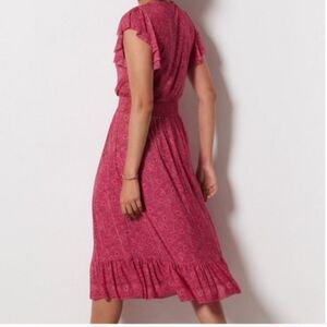 Chic pink floral midi dress with ruffled sleeves. Perfect for any occasion.
