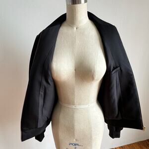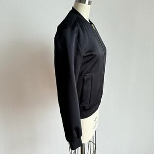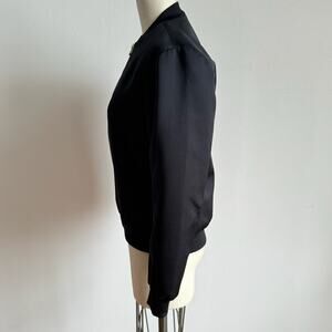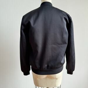 Details: Insulated black bomber jacket with 2 welted pockets, 1 internal pocket, and a gold zipper closure. Perfect classic look, a great layering piece.