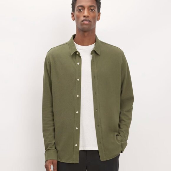 Everlane mens button down, Everlane green long sleeve, Everlane mens top, Unisex, Comfortable, Travel Wear, Mens Button Down, Casual Long Sleeve Shirt, Cotton Button Down, Stretchy Button Down, Soft, Olive Green, Everlane, Good Earth Cotton, long sleeve, button-up shirt, collared top, minimalist, sustainable fashion, slow fashion, ethical brand, closet staple, workwear, elevated basics, casual chic, neutral tone, olive green, organic cotton, everyday essential, transitional layer, classic style, modern basics, timeless fit, Minimalist, business casual