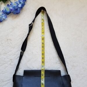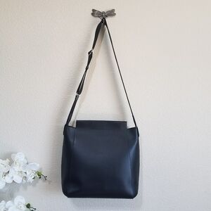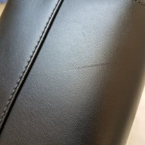 In excellent condition with a light scratch on bottom see last photo-not really noticeable, leather, black, adjustable cloth strap, one interior pocket, magnetic closure.