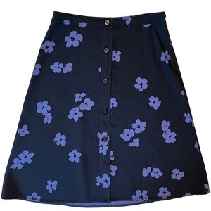Beautiful Floral Print Japanese GoWeave Swing Skirt from Everlane. This Skirt features a swing style silhouette with a faux button down front. The bottom two buttons open for a front open split detail. Side hidden zipper closure. Floral print design in Lilac with a Navy Blue background. 100% Triacetate woven fabric construction. Beautiful swing fit with a lovely, feminine drape. Woman’s Size 10