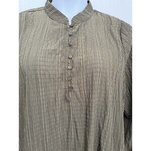 Made of lightweight polyester, this blouse is machine washable for easy care. The solid olive green color and fall theme make it a versatile addition to any outfit. Available in size 1X, this relaxed fit blouse is perfect for plus size women. Buy now to add a touch of cottage and bohemian style to your wardrobe! Blouse is in excellent preowned condition with no obvious flaws holes or stains. Measurements in photos. I appreciate your business and strive for a five star routine. Please feel free to message me with questions.
