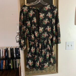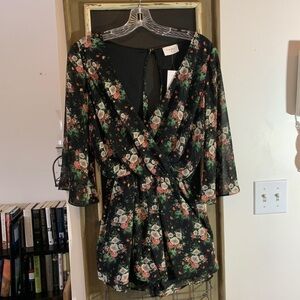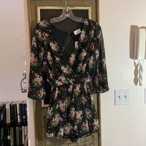 A sophisticated surplice neckline romper is decorated with chic floral prints and an elasticized waistline for a simple, yet elegant summer apparel. Fit: this style fits true to size. - Surplice neck - 3/4 length sleeves - Back keyhole with button-loop closure - Allover floral print - Elasticized waist - Lined - Approx. 2" inseam, 29" length Made in USA