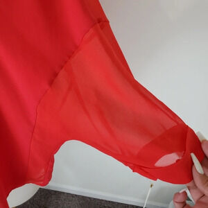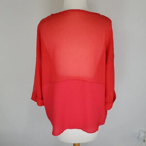 Everly pop over blouse sz Medium, worn a couple times and is in excellent condition!! Light weight, reddish coral in color, boat neckline, sheer short sleeves with cuff, sheer back panel. Oversized fit.