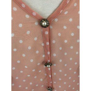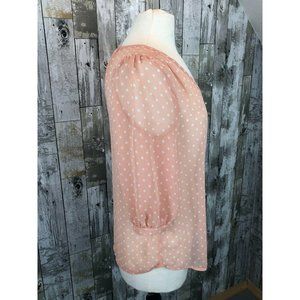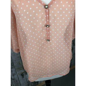 EVERLY WOMEN'S PEACH SHEER BLOUSE WITH WHITE POLKA DOT. SIZE SMALL. LAYING FLAT ARMPIT TO ARMPIT MEASURES 19" AND SHOULDER TO BOTTOM 22.5". PREOWNED IN GOOD CONDITION.