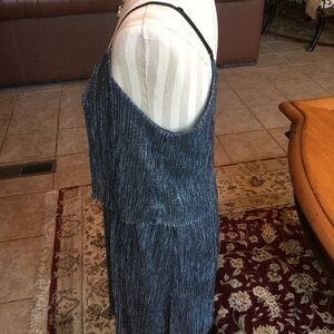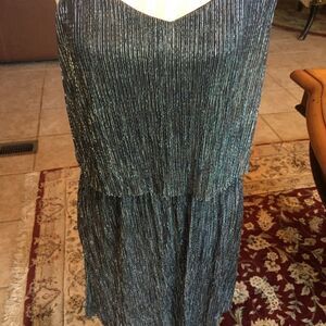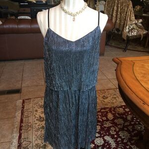 Everly Foil Ruffle Shimmer Dress! Elastic waist with adjustable straps and fully lined! Poly.