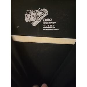 This product is a black XL T-shirt from the band Everyday Vandals, featuring a crew neck and short sleeves. Made of cotton, this machine washable shirt is perfect for all seasons and is designed with rock, music, and 90s themes in mind. The shirt is easy to care for, preshrunk, and comes with a tagless design for added comfort. Whether for winter, summer, fall, or spring, this shirt is a stylish and versatile choice for any man looking to add a touch of Rock 'n' Roll to their wardrobe.